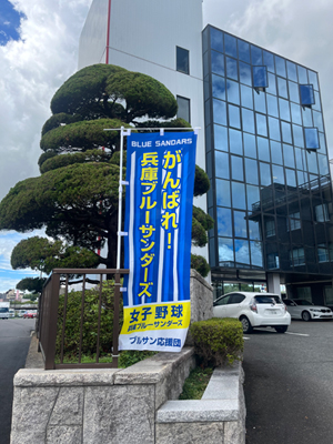 後日、応援旗もいただきましたので、早速弊社入口に飾らせていただきました。
